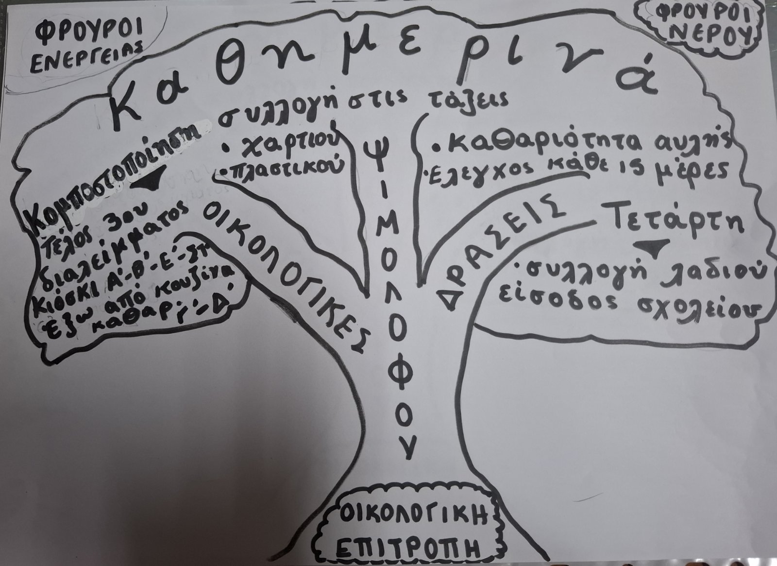 Ετοιμασία από την οικολογική επιτροπή του προγράμματος με τις οικολογικές δράσεις που γίνονται στο σχολείο. Κάθε μέλος πήρε στην τάξη του ένα πρόγραμμα και ενημέρωσε τα παιδιά της τάξης του .